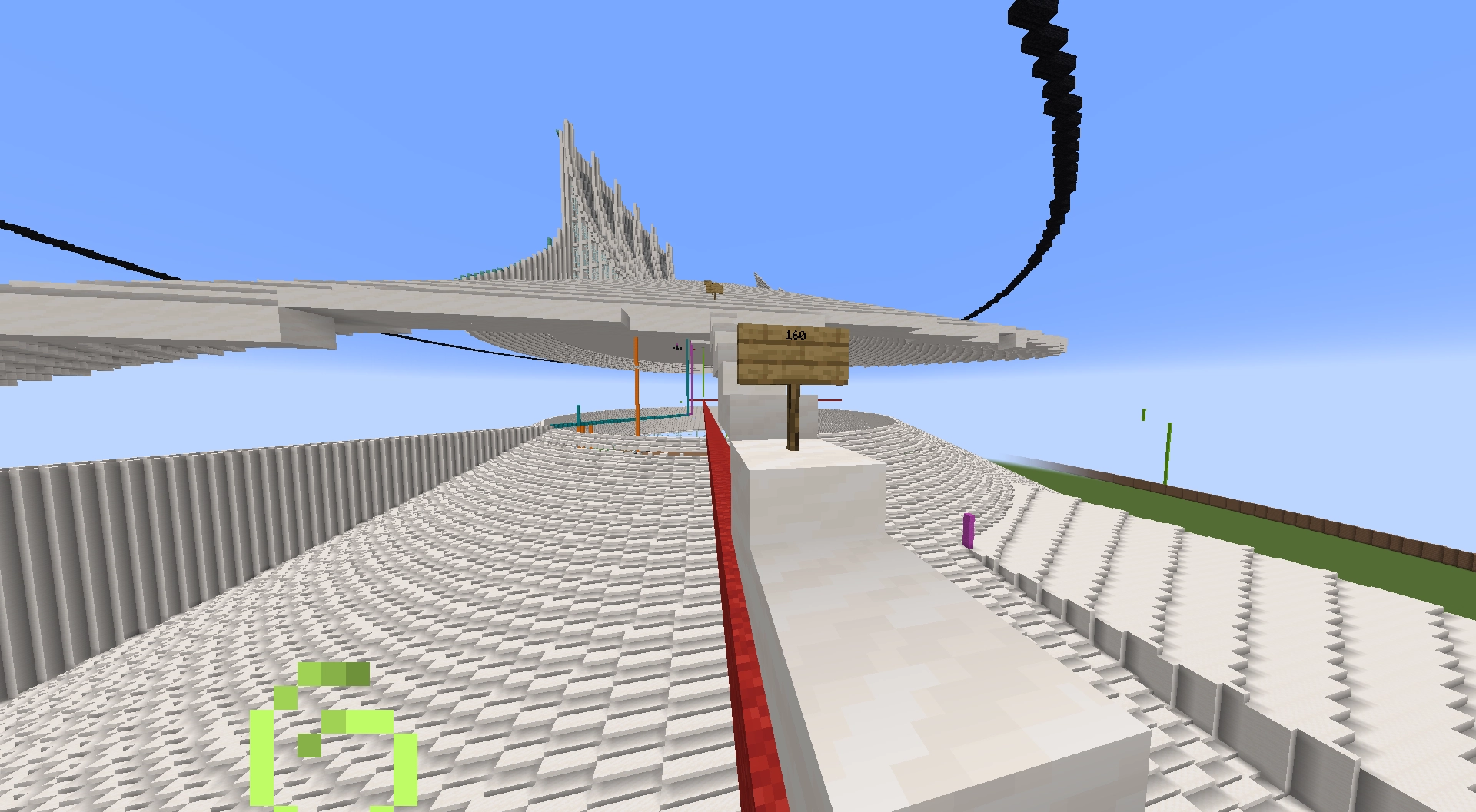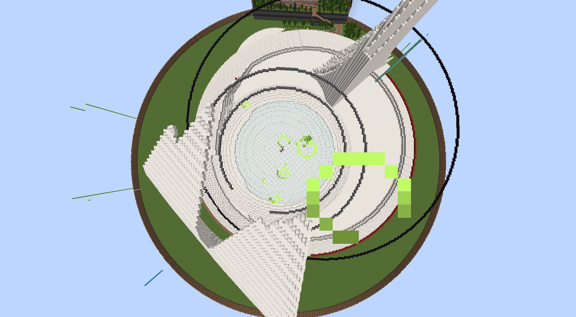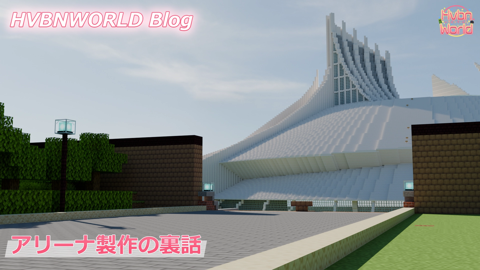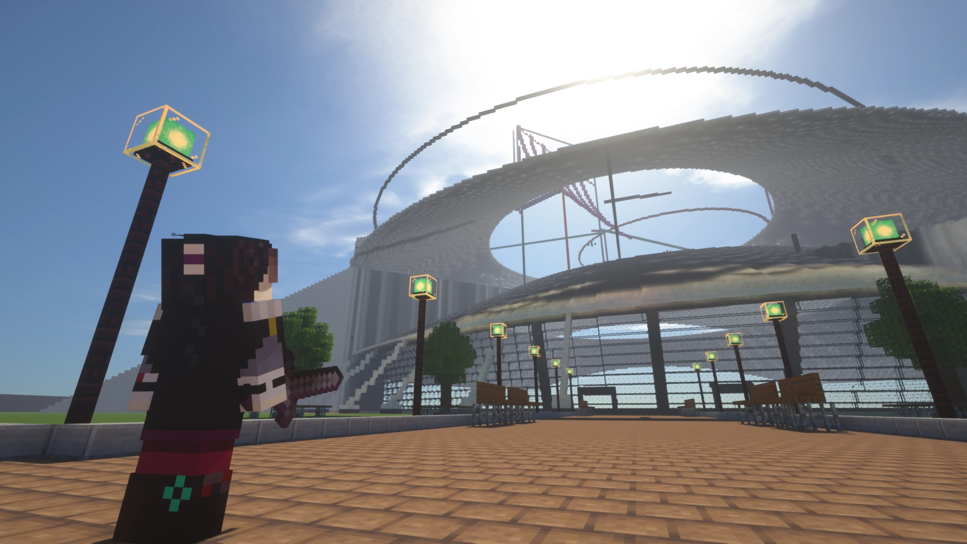 まず初めに、下層部分のガラスや第一の屋根、アリーナ手前の道、謎の三日月部分などをサーバー管理者kumagamesさん含むクリエイター複数名で製作しました。